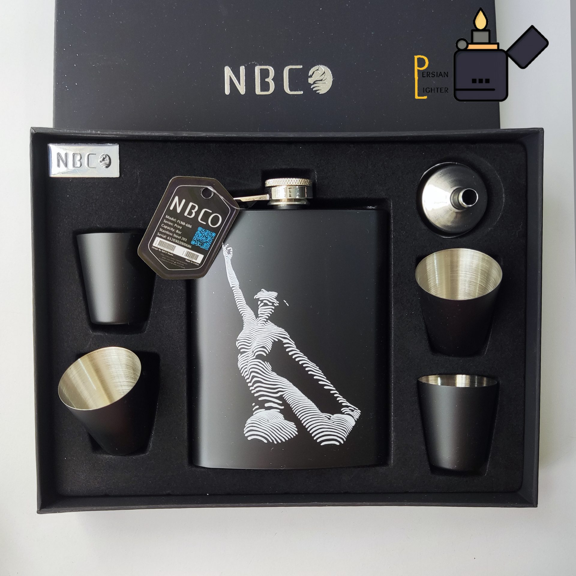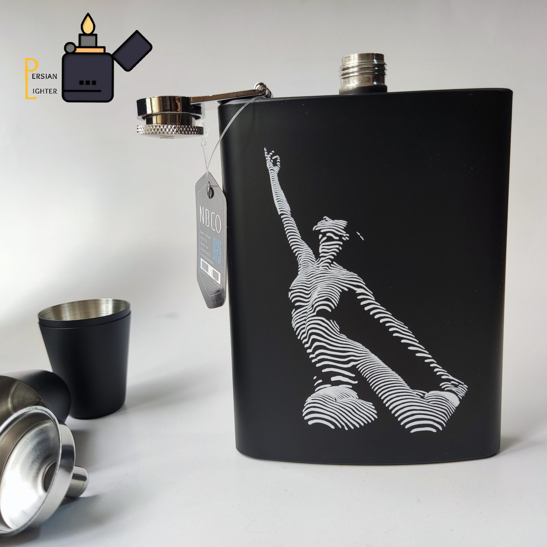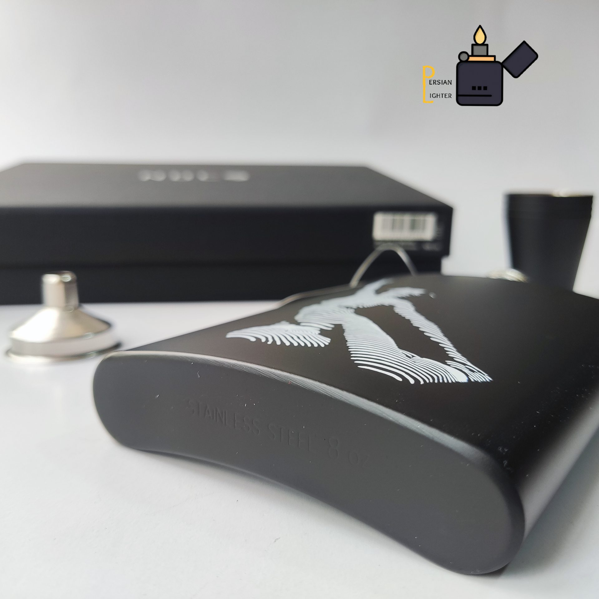 بطری استیل oz ۸ + قیف نقره ای + ۴ تا شات استیل مشکی